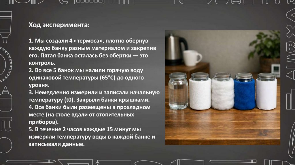 Ход эксперимента:1. Мы создали 4 «термоса», плотно обернув