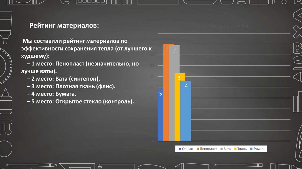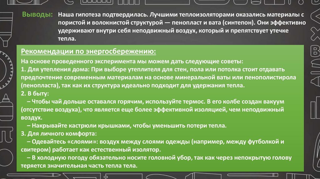 Выводы: Наша гипотеза подтвердилась. Лучшими теплоизоляторами оказались материалы спористой и волокнистой структурой — пенопласт и вата (синтепон). Они эффективно