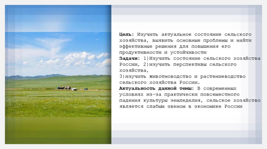 Цель: Изучить актуальное состояние сельскогохозяйства, выявить основные проблемы и найти