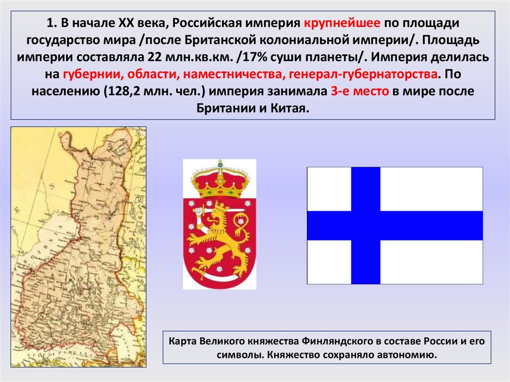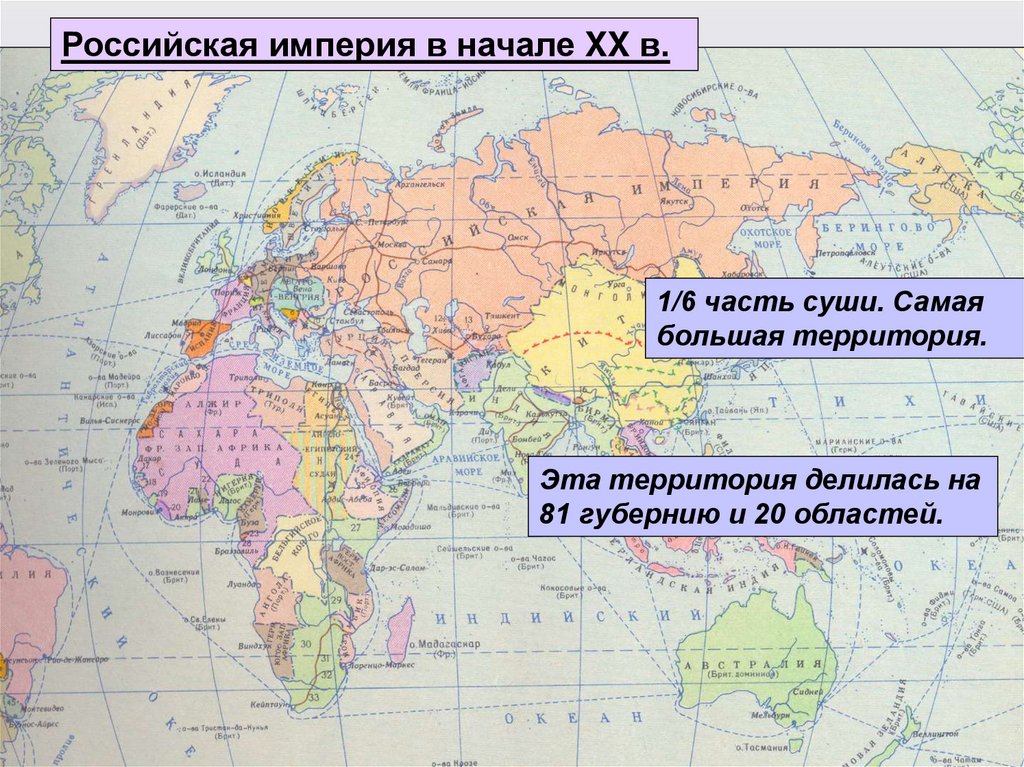 1. В начале ХХ века, Российская империя крупнейшее по площадигосударство мира /после Британской колониальной империи/. Площадь