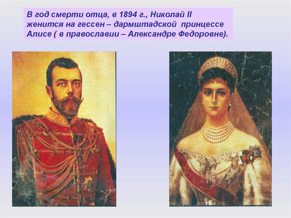В год смерти отца, в 1894 г., Николай IIженится на гессен – дармштадской принцессе