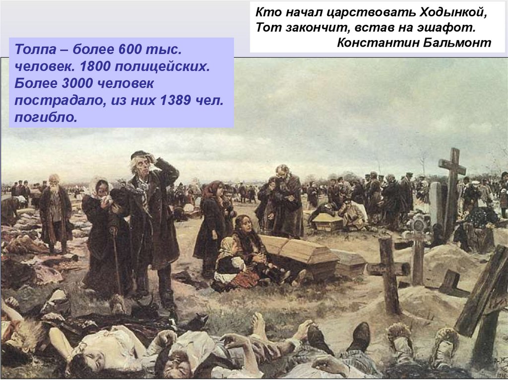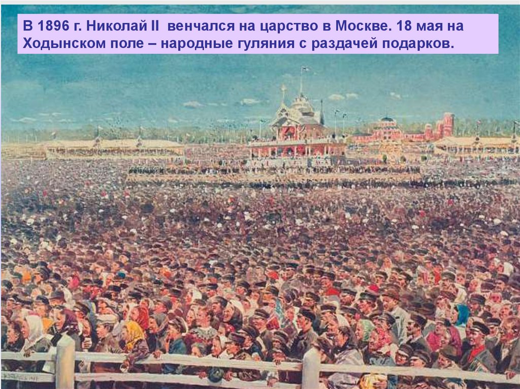 В 1896 г. Николай II венчался на царство в Москве. 18 мая наХодынском поле – народные гуляния с раздачей подарков.