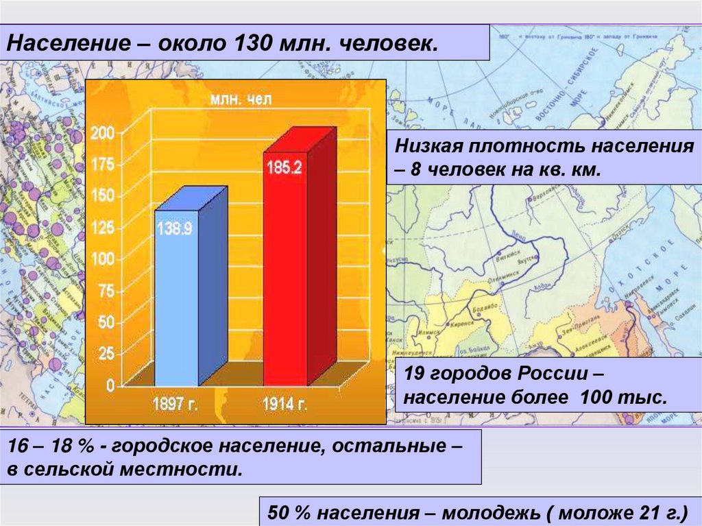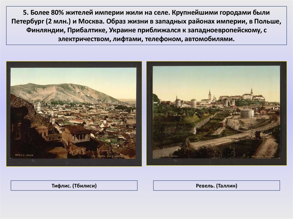 5. Более 80% жителей империи жили на селе. Крупнейшими городами былиПетербург (2 млн.) и Москва. Образ жизни в западных районах империи, в Польше,