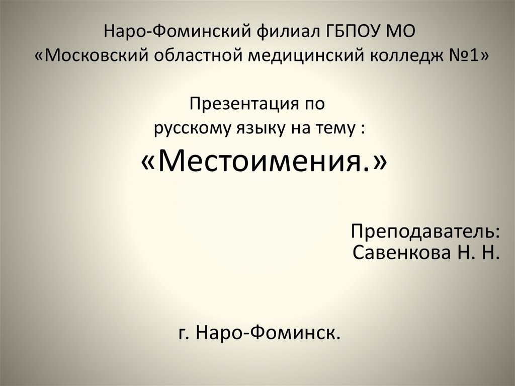 1. Наро-Фоминский филиал ГБПОУ МО «Московский областной медицинский колледж №1» Презентация по русскому языку на тему :