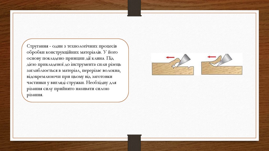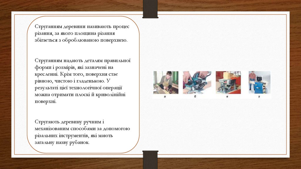 Стругання - знімання різальним інструментом з поверхні деревини шару матеріалу.