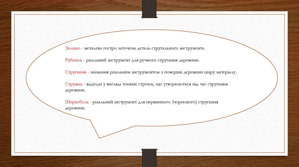 Залізко - металева гостро заточена деталь стругального інструмента.Рубанок - різальний інструмент для ручного стругання деревини.