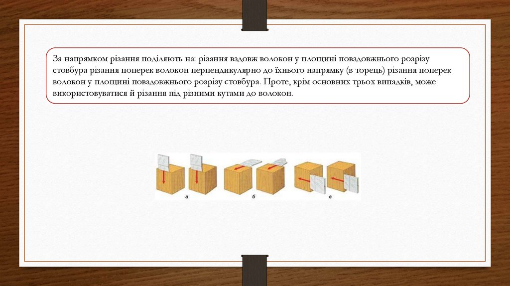 За напрямком різання поділяють на: різання вздовж волокон у площині повздовжнього розрізустовбура різання поперек волокон перпендикулярно до їхнього напрямку (в торець) різання поперек