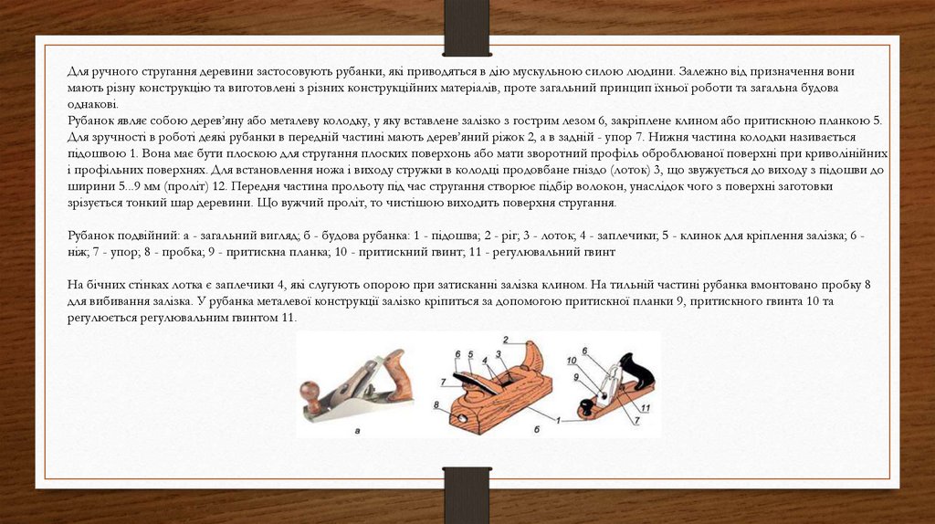 Рубанок являє собою дерев’яну або металеву колодку, у яку вставлене залізко з гострим лезом 6, закріплене клином або притискною планкою 5.