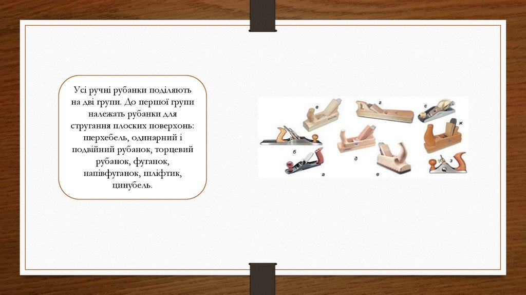 Усі ручні рубанки поділяютьна дві групи. До першої групи