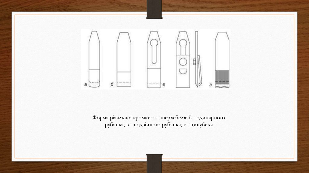 Форма різальної кромки: a - шерхебеля; б - одинарногорубанка; в - подвійного рубанка; г - цинубеля