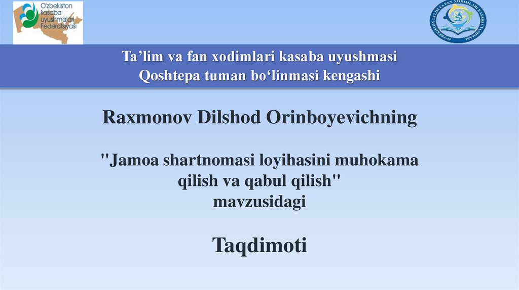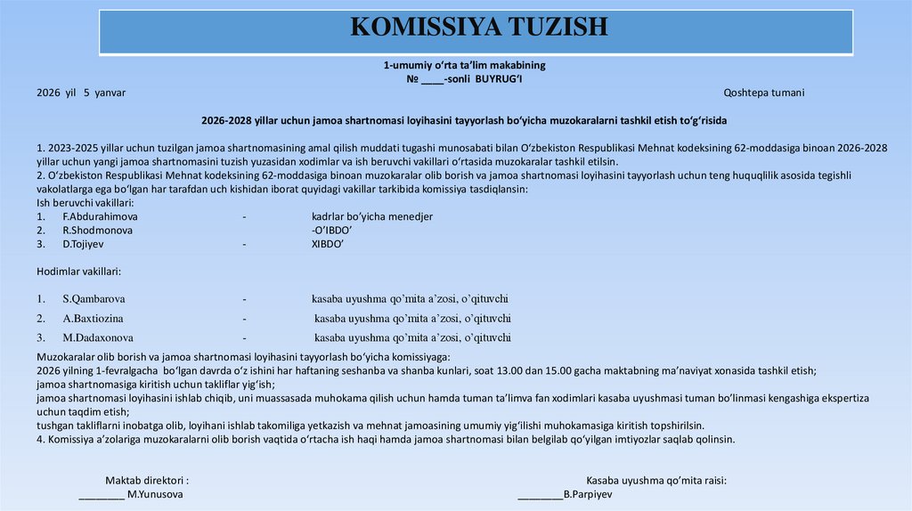1. Қўштепа тумани 1-умумий урта таълим мактабининг 2026-2028 йиллар учун жамоа шартномасини тузиш юзасидан иш берувчи билан