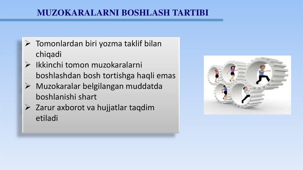 4. Иш берувчи вакилларининг шахсий таркиби, музокараларнинг муддати, ўтказиладиган жойи ва кун тартибини иш