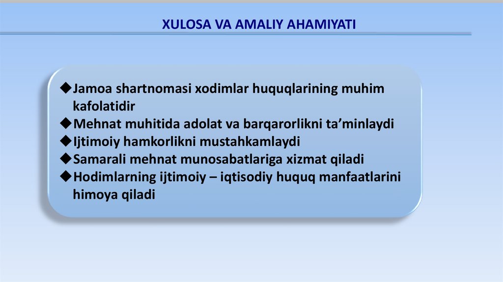 XULOSA VA AMALIY AHAMIYATIJamoa shartnomasi xodimlar huquqlarining muhim