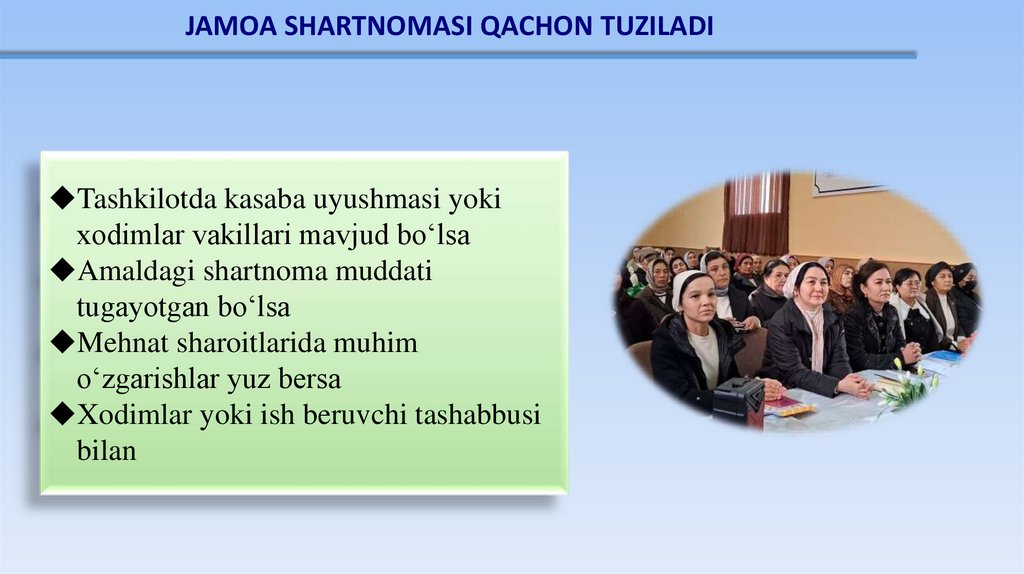 JAMOA SHARTNOMASI QACHON TUZILADITashkilotda kasaba uyushmasi yoki
