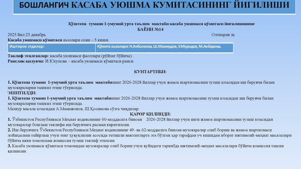 БОШЛАНГИЧ КАСАБА УЮШМА КУМИТАСИНИНГ ЙИГИЛИШИҚўштепа тумани 1-умумий урта таълим мактаби касаба уюшмаси қўмитаси йиғилишининг