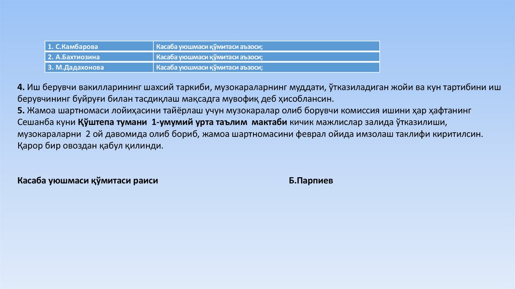 Таклиф этилганлар: касаба уюшмаси фаоллари (рўйхат бўйича).