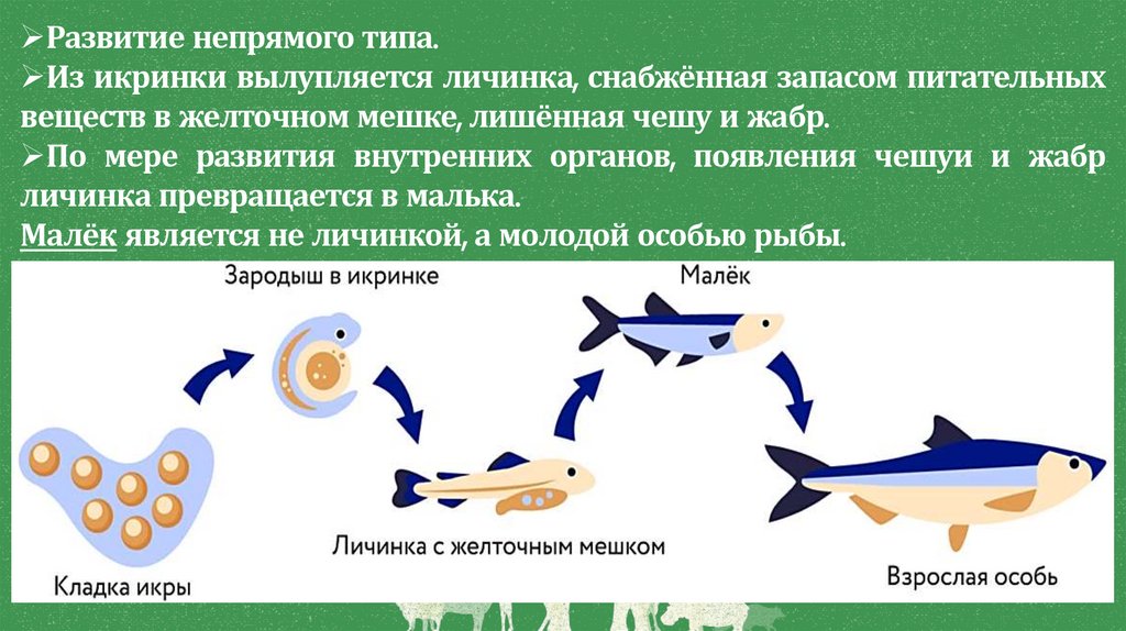 Развитие непрямого типа.Из икринки вылупляется личинка, снабжённая запасом питательных