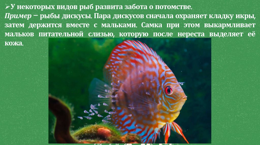 У некоторых видов рыб развита забота о потомстве.Пример – рыбы дискусы. Пара дискусов сначала охраняет кладку икры,