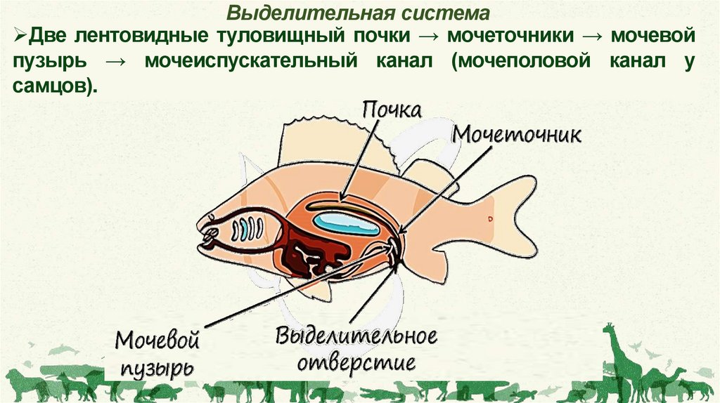 Выделительная системаДве лентовидные туловищный почки → мочеточники → мочевой