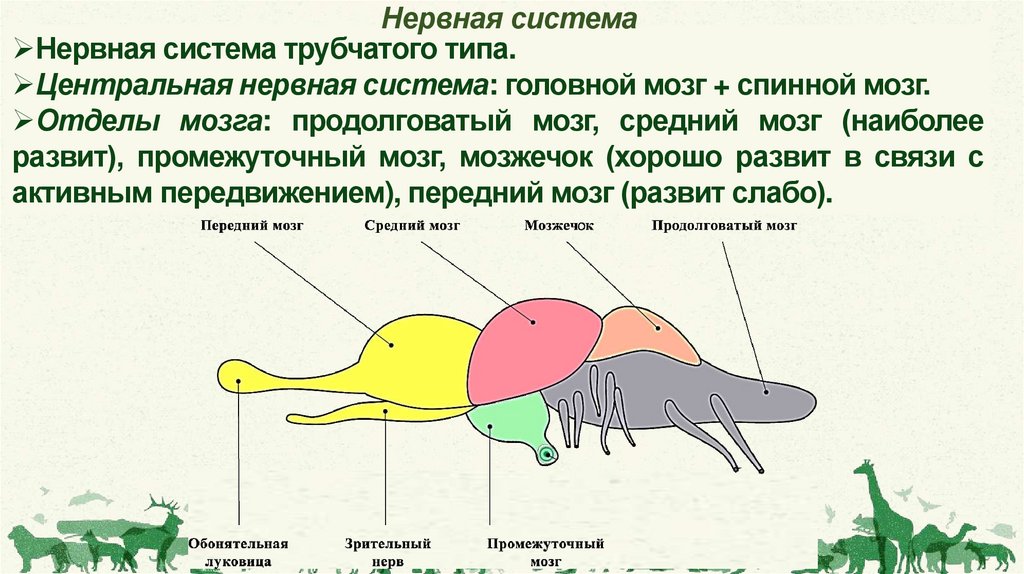 развит), промежуточный мозг, мозжечок (хорошо развит в связи с
