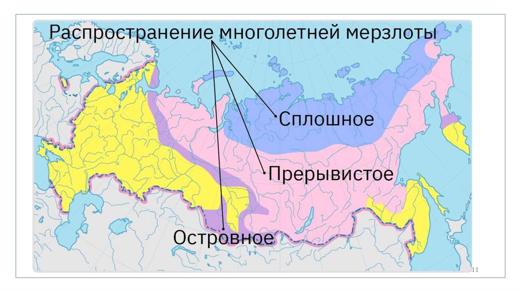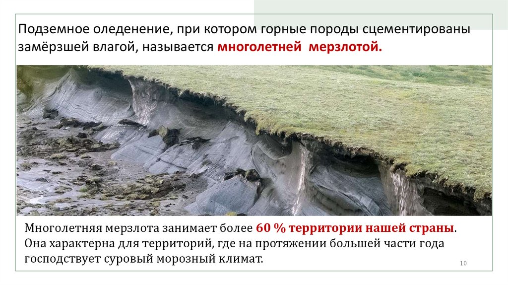 Подземное оледенение, при котором горные породы сцементированызамёрзшей влагой, называется многолетней мерзлотой.