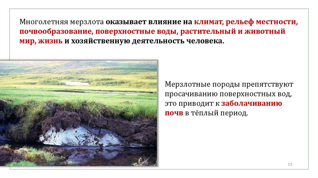 Многолетняя мерзлота оказывает влияние на климат, рельеф местности,почвообразование, поверхностные воды, растительный и животный