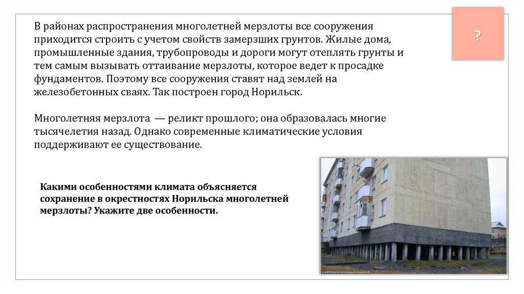 ?Многолетняя мерзлота оказывает влияние на хозяйственную деятельность человека: