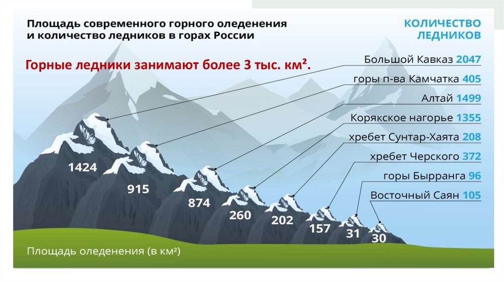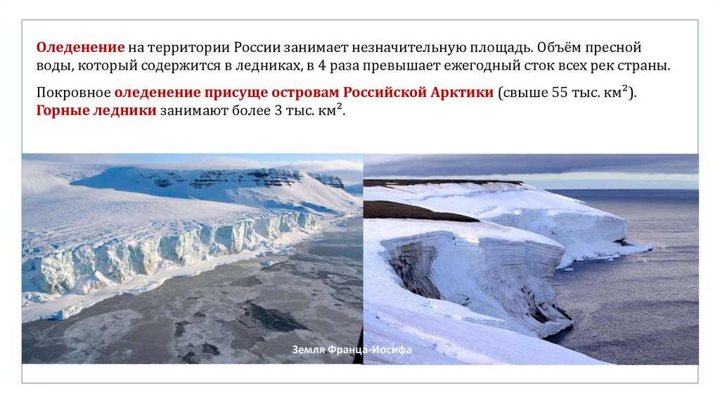 Оледенение на территории России занимает незначительную площадь. Объём преснойводы, который содержится в ледниках, в 4 раза превышает ежегодный сток всех рек страны.