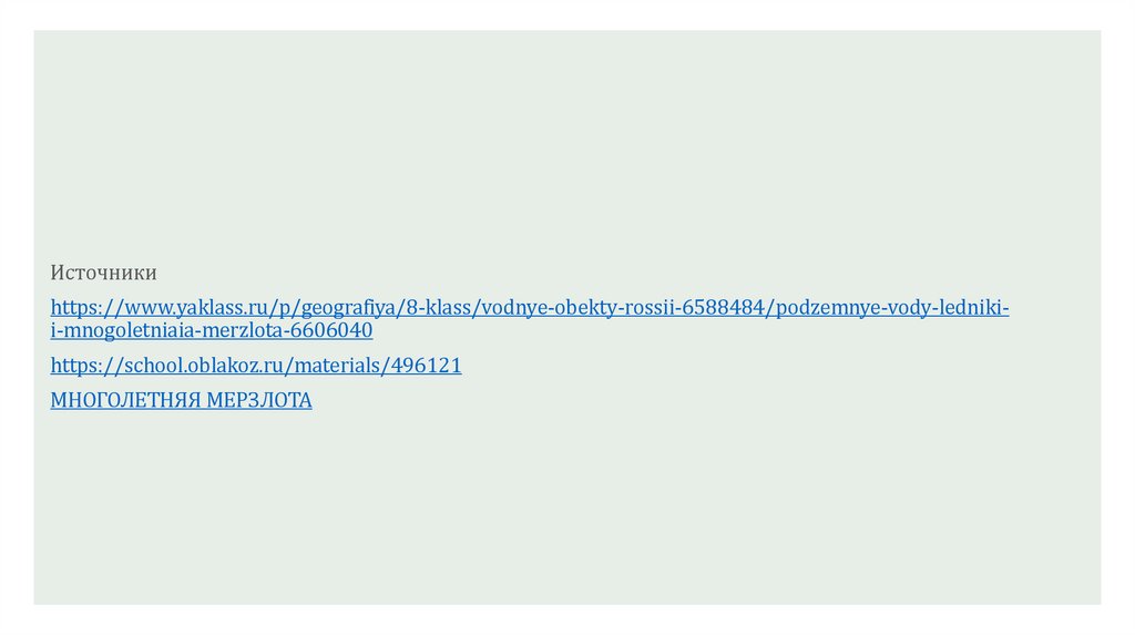 Источникиhttps://www.yaklass.ru/p/geografiya/8-klass/vodnye-obekty-rossii-6588484/podzemnye-vody-lednikii-mnogoletniaia-merzlota-6606040