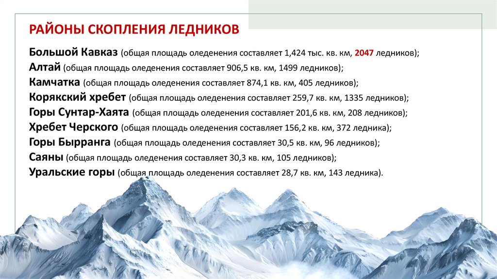 РАЙОНЫ СКОПЛЕНИЯ ЛЕДНИКОВБольшой Кавказ (общая площадь оледенения составляет 1,424 тыс. кв. км, 2047 ледников);