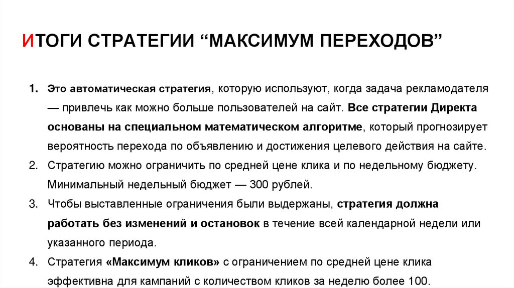 ИТОГИ СТРАТЕГИИ “МАКСИМУМ ПЕРЕХОДОВ”1. Это автоматическая стратегия, которую используют, когда задача рекламодателя