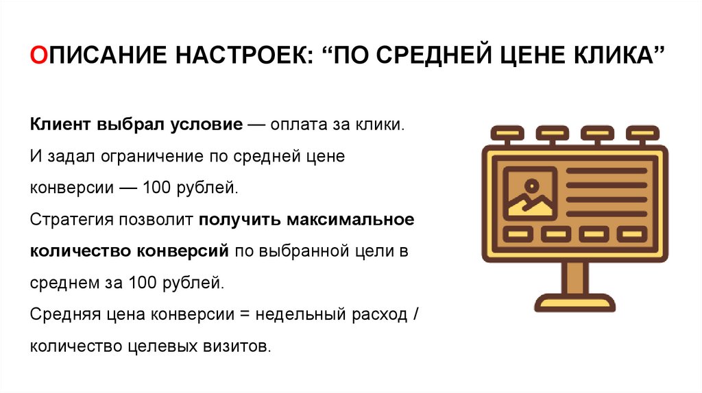 ОПИСАНИЕ НАСТРОЕК: “ПО СРЕДНЕЙ ЦЕНЕ КЛИКА”Клиент выбрал условие — оплата за клики.