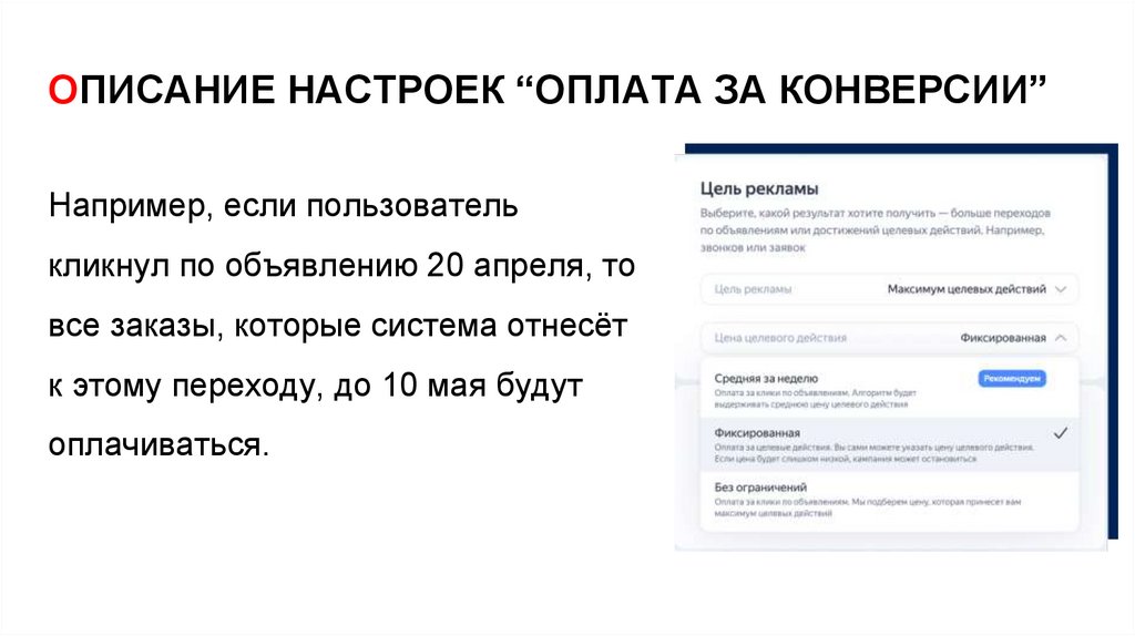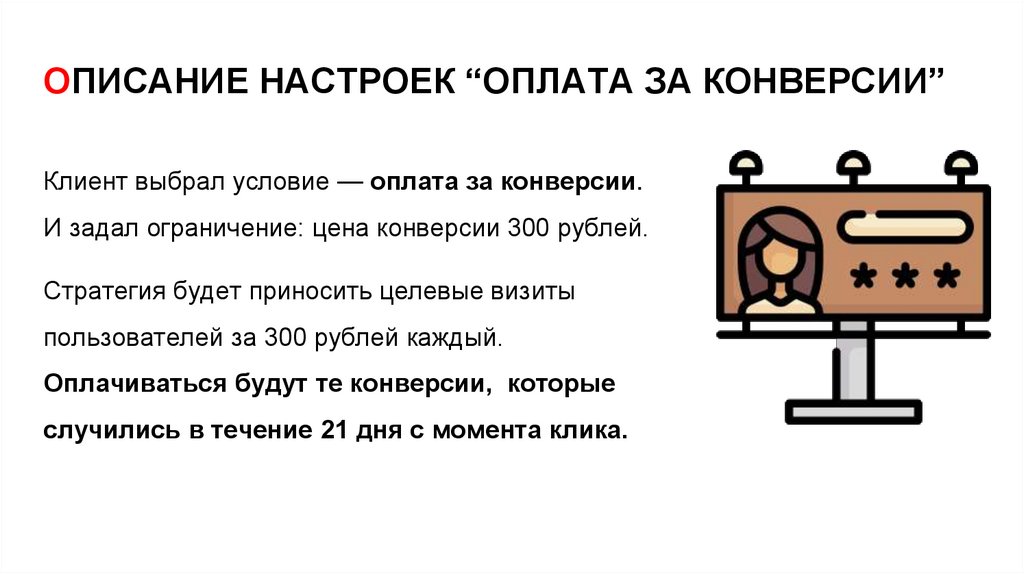 ОПИСАНИЕ НАСТРОЕК “ОПЛАТА ЗА КОНВЕРСИИ”Клиент выбрал условие — оплата за конверсии.
