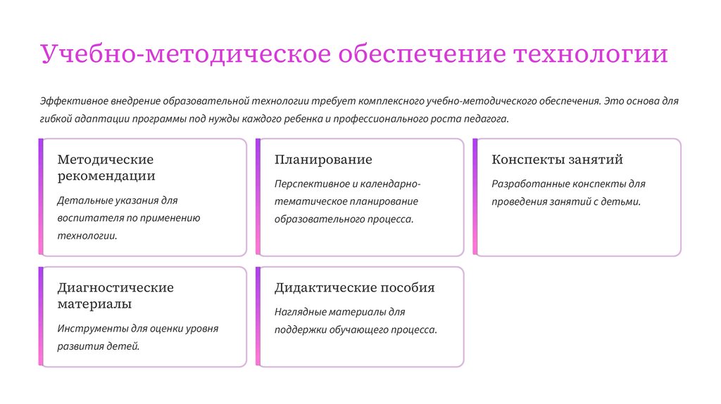 Учебно-методическое обеспечение технологииЭффективное внедрение образовательной технологии требует комплексного учебно-методического обеспечения. Это основа для
