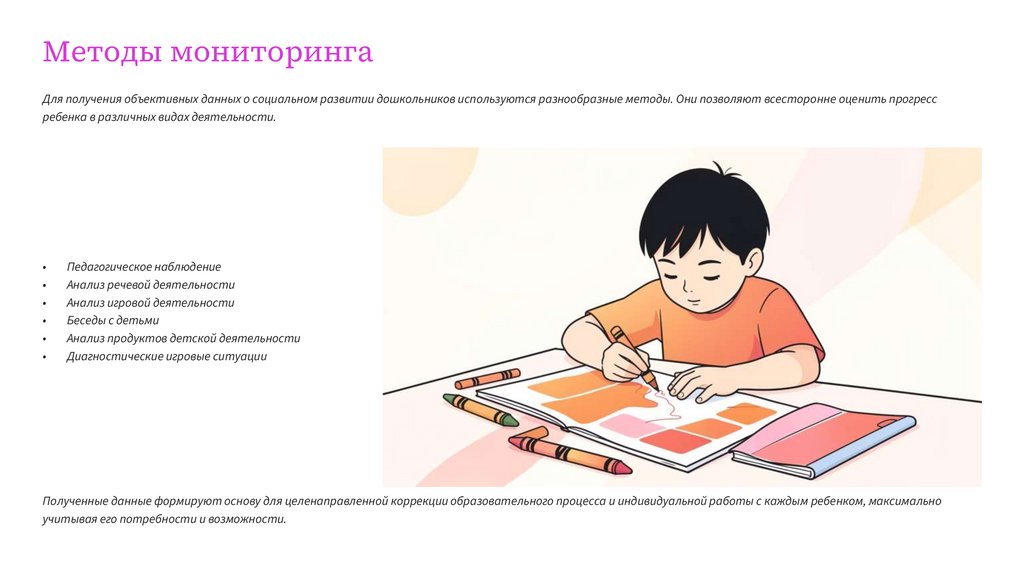 Методы мониторингаДля получения объективных данных о социальном развитии дошкольников используются разнообразные методы. Они позволяют всесторонне оценить прогресс