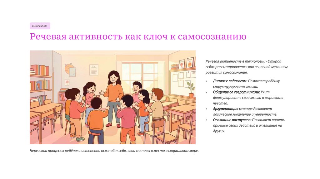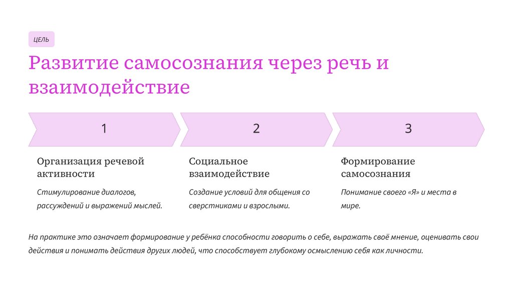На практике это означает формирование у ребёнка способности говорить о себе, выражать своё мнение, оценивать свои