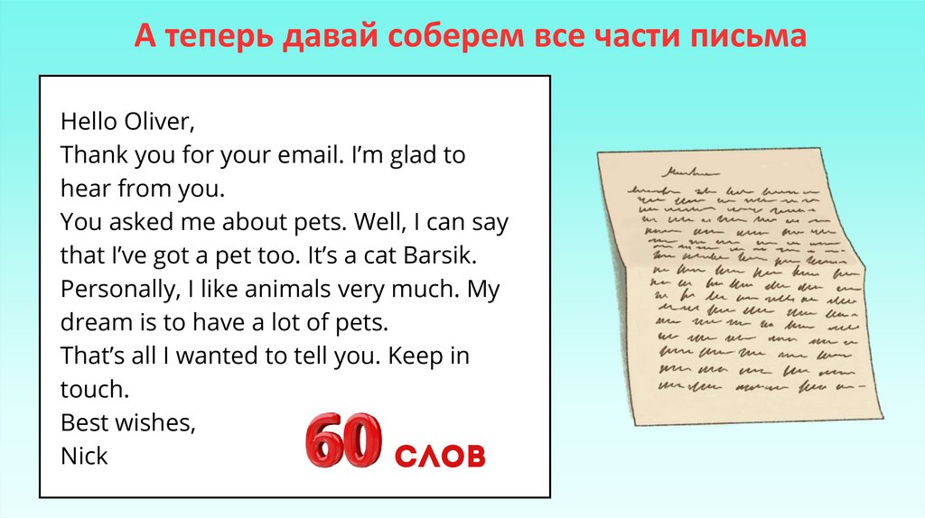 А теперь давай соберем все части письмаHello Oliver,