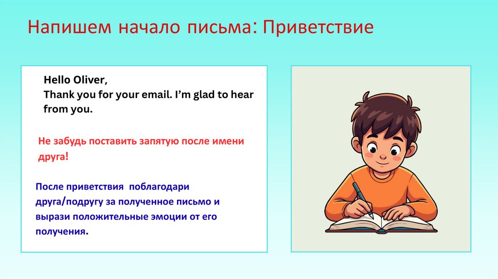 оформления письма. Не пишите адрес и дату. Не забудьте поблагодарить друга