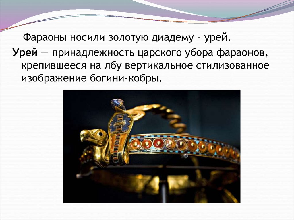 Фараоны носили золотую диадему – урей.Урей — принадлежность царского убора фараонов,