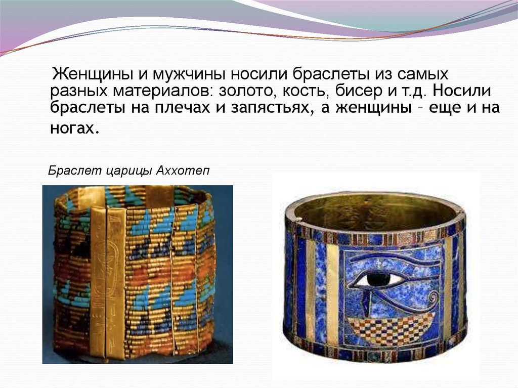Египтянам были известны практически все видыукрашений, которые используются и сейчас. Самым