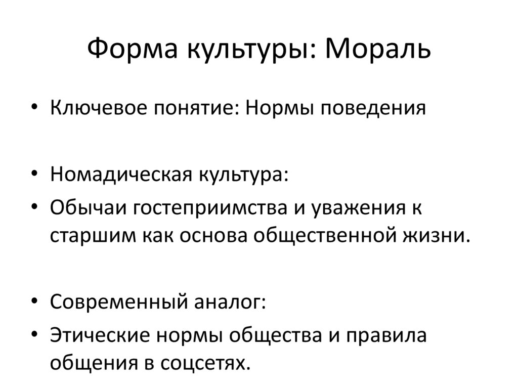 Форма культуры: Мораль• Ключевое понятие: Нормы поведения