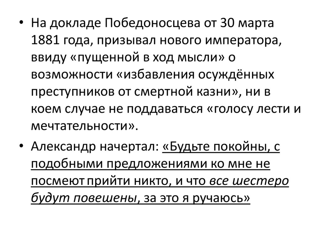 • На докладе Победоносцева от 30 марта1881 года, призывал нового императора,