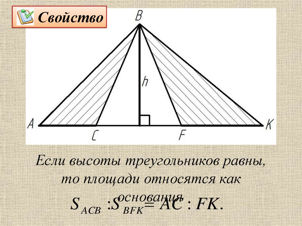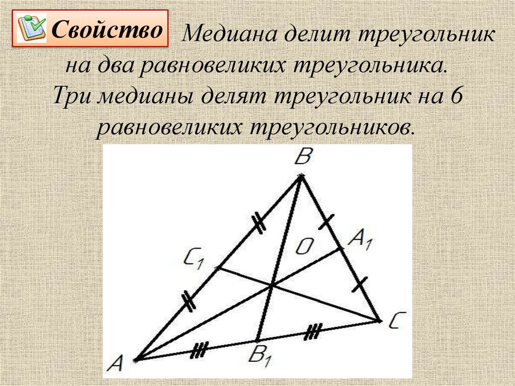 Свойство Медиана делит треугольникна два равновеликих треугольника.