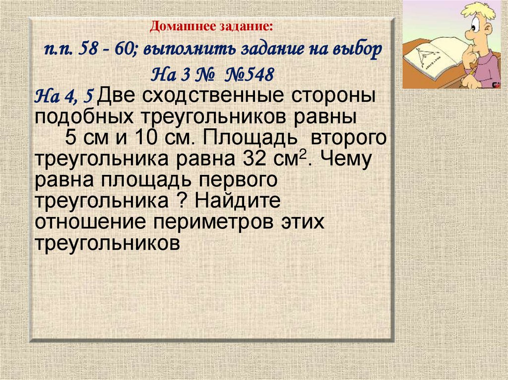 Домашнее задание:п.п. 58 - 60; выполнить задание на выбор