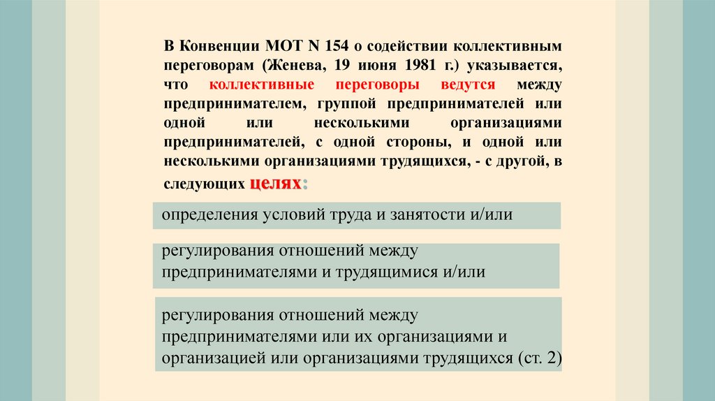 В Конвенции МОТ N 154 о содействии коллективнымпереговорам (Женева, 19 июня 1981 г.) указывается,