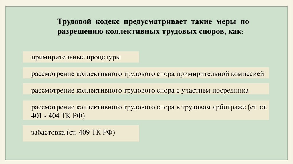 Трудовой кодекс предусматривает такие меры поразрешению коллективных трудовых споров, как: