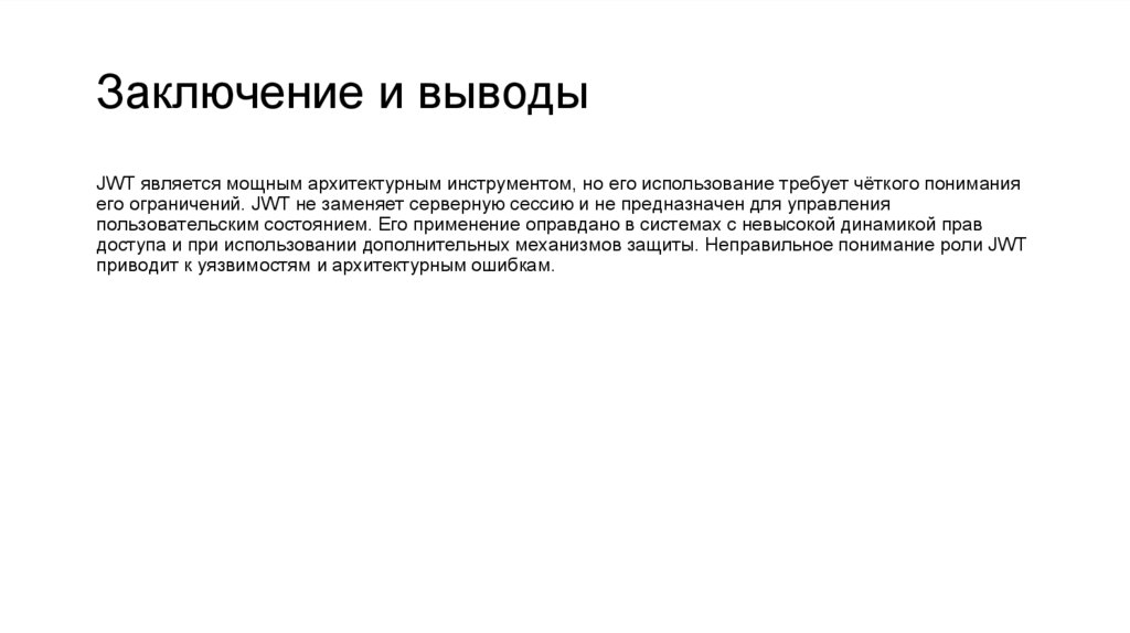Заключение и выводыJWT является мощным архитектурным инструментом, но его использование требует чёткого понимания