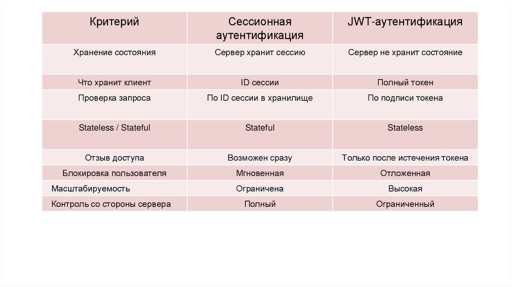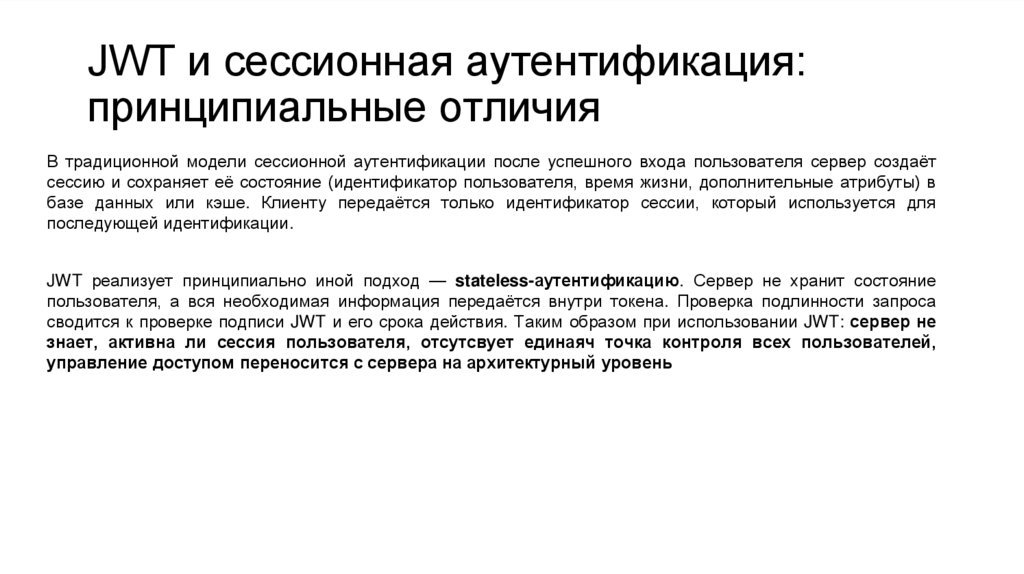 JWT реализует принципиально иной подход — stateless-аутентификацию. Сервер не хранит состояние