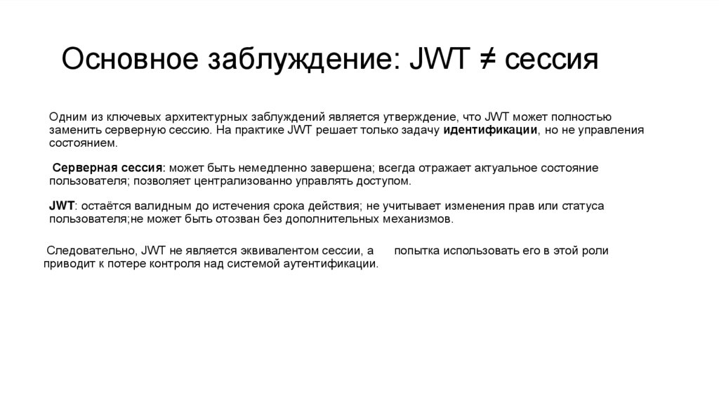 Основное заблуждение: JWT ≠ сессияОдним из ключевых архитектурных заблуждений является утверждение, что JWT может полностью