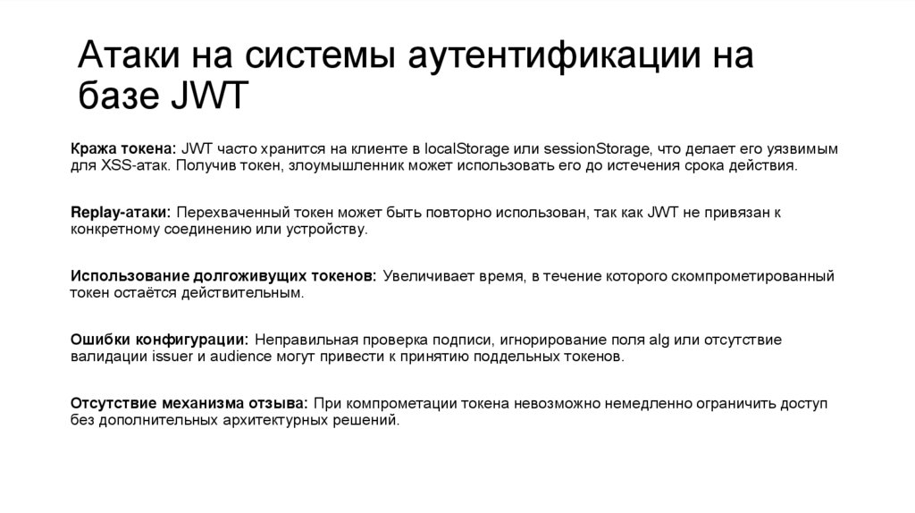 Replay-атаки: Перехваченный токен может быть повторно использован, так как JWT не привязан к